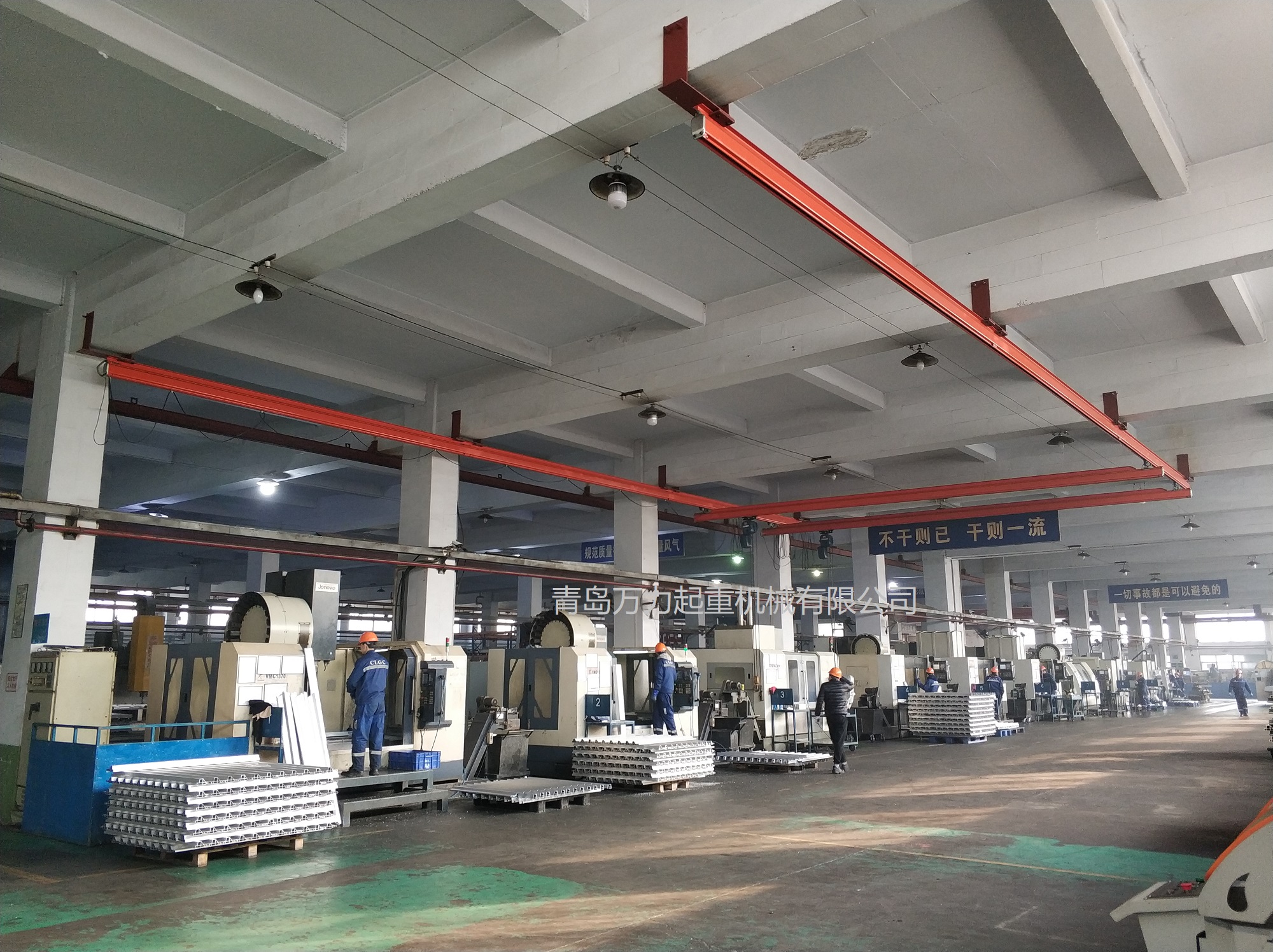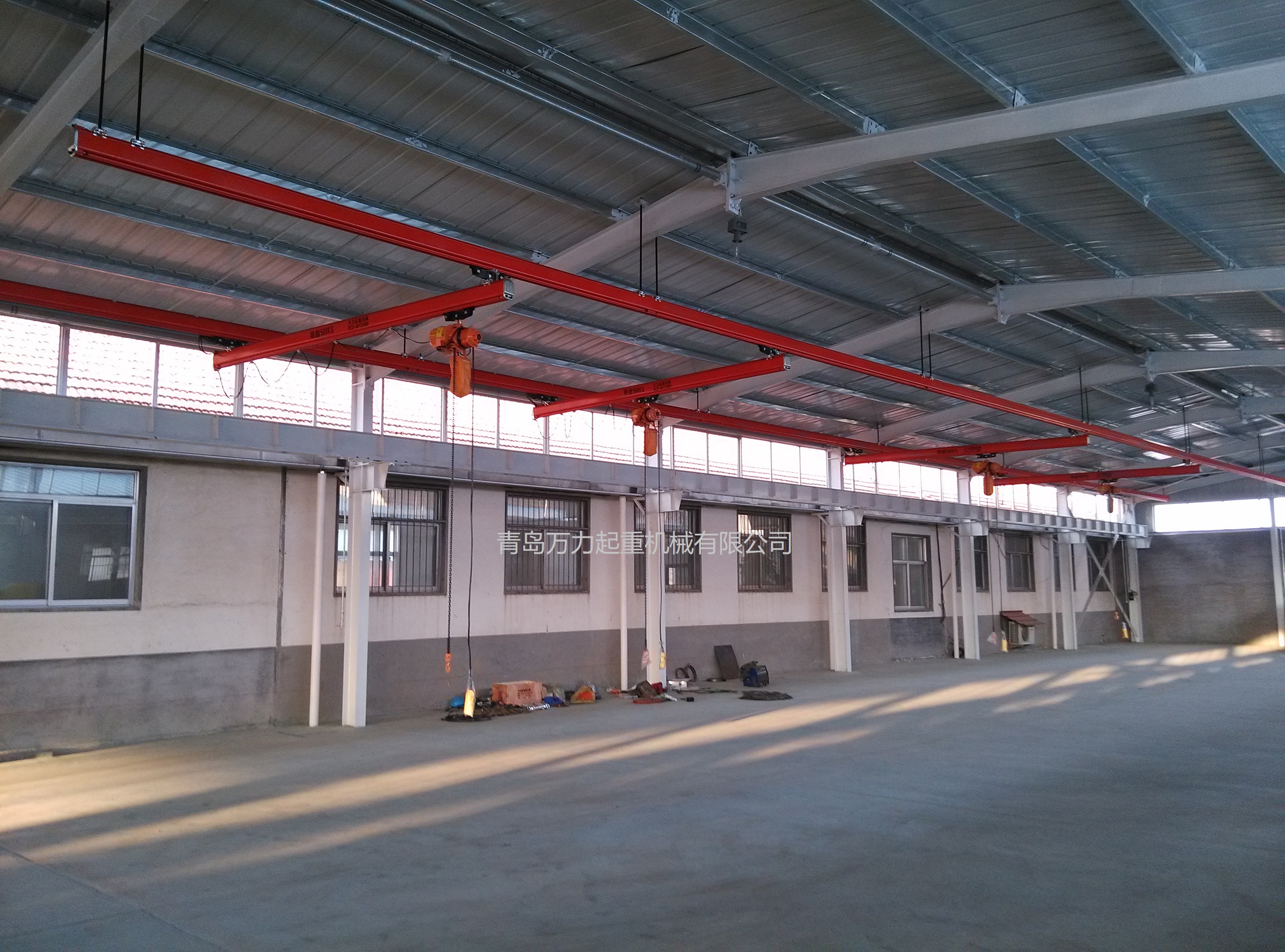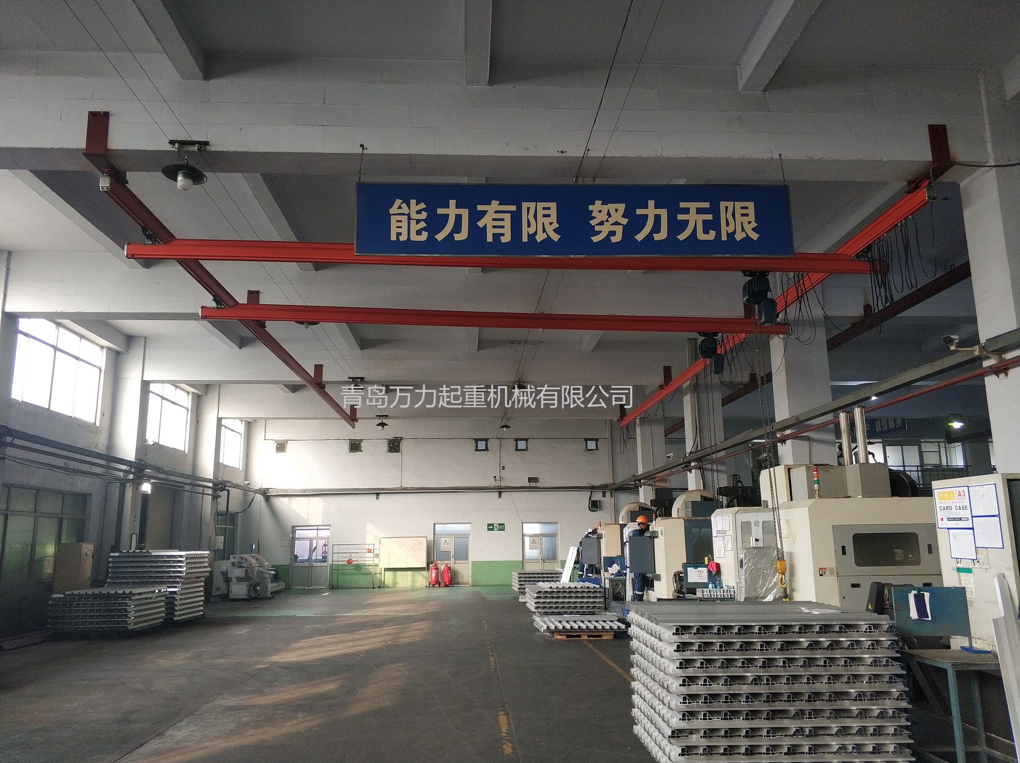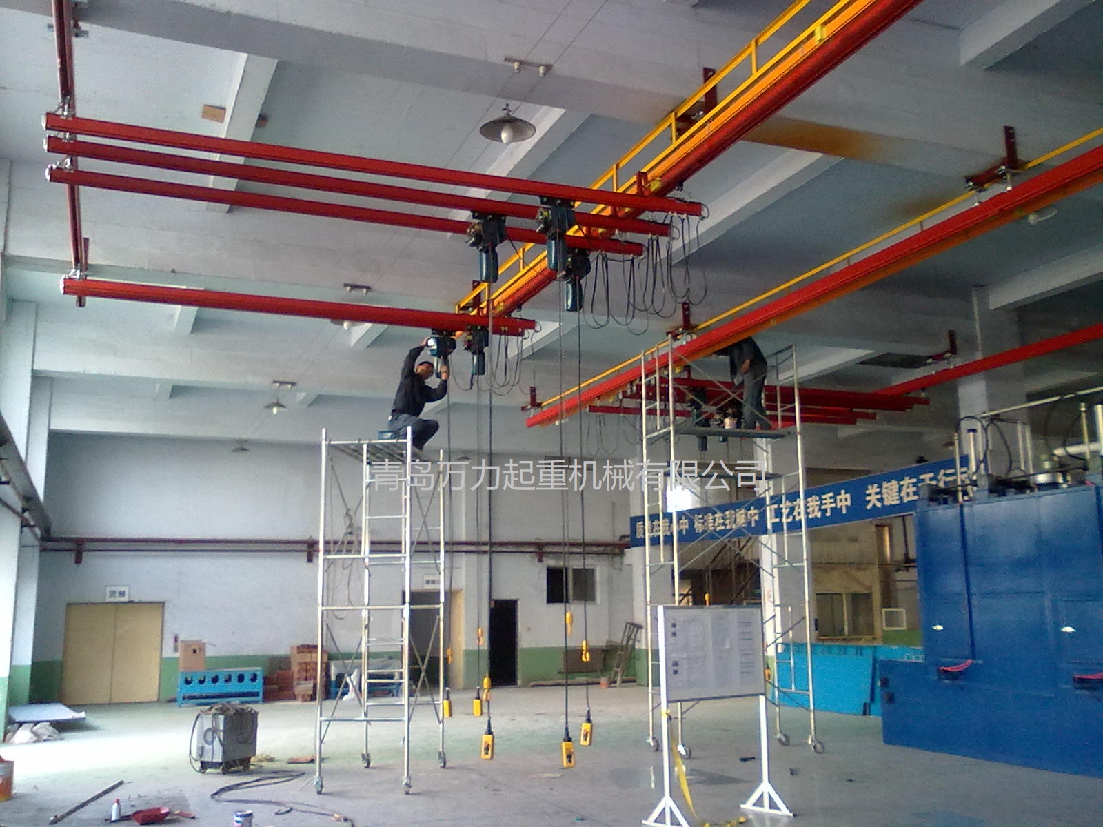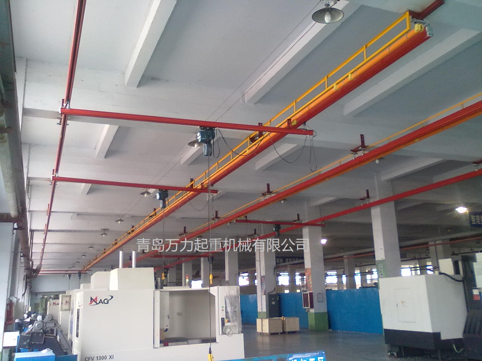 KBK,為Kombiniert Kran的縮寫,意為組合式起重機。主要由軌道、懸掛裝置、行走小車和一些功能組件構成,所有模塊都為標準組件。起升裝置主要采用環(huán)鏈電動葫蘆,也可吊掛一些機械手或焊槍之類,作為工具滑軌使用。起重量一般為125kg-2000kg。KBK軌道-采用Ω形狀,2片焊接而成。常用的是KBKII型軌道,多根軌道可用高強度螺栓連接。彎軌的轉彎半徑1.5m,大彎可用直軌搭配。沒有更小半徑的,會對小車運行有影響。(KBKI型軌道轉彎半徑1m,在此不做介紹)。也可在KBKII型軌道內(nèi)側安裝內(nèi)置滑觸線,用于葫蘆供電,稱為KBKII-R型。懸掛裝置一般可以安裝在工字鋼/H型鋼下緣,有一定自鎖功能,安裝簡便牢靠。功能組件包括:道岔,十字轉盤,升降段等。KBK組合起重機包括-單軌起重機、-單梁起重機、-雙梁起重機、-伸縮梁、-堆垛機等各種型式的起重設備,起重量0.125t~2t適應范圍極廣,尤其適用于現(xiàn)代化生產(chǎn)輸送線,其特點概述如下: 1、可靠性好、穩(wěn)定性高 KBK輕型起重機系統(tǒng)的組成部件全部是標準模塊,可以保證大批量、高質(zhì)量生產(chǎn),因而系統(tǒng)十分可靠;系統(tǒng)模塊的主體是三種規(guī)格的冷軋型材,強度大,剛度好,自重輕,保證了系統(tǒng)的穩(wěn)定性。 2、適應能力強 KBK系統(tǒng)可根據(jù)工廠各工位的需要,靈活地設計安裝起重機系統(tǒng),從定點運送到高準確度地多點、多節(jié)拍的自動化輸送線,都能隨意組合而成。可用于新設計的廠房,也可用于舊系統(tǒng)的改造或延伸。3、安裝方便,經(jīng)濟高效 KBK系統(tǒng)的安裝調(diào)試很方便,型材及各標準模塊之間只須用螺栓連接即可使用,可節(jié)省工廠的空間和面積,大大減少了人力資源,提高生產(chǎn)效率,從而降低能耗,提高企業(yè)效益。系統(tǒng)可以手動操作,也可以實現(xiàn)自動、半自動操作,運行高效。