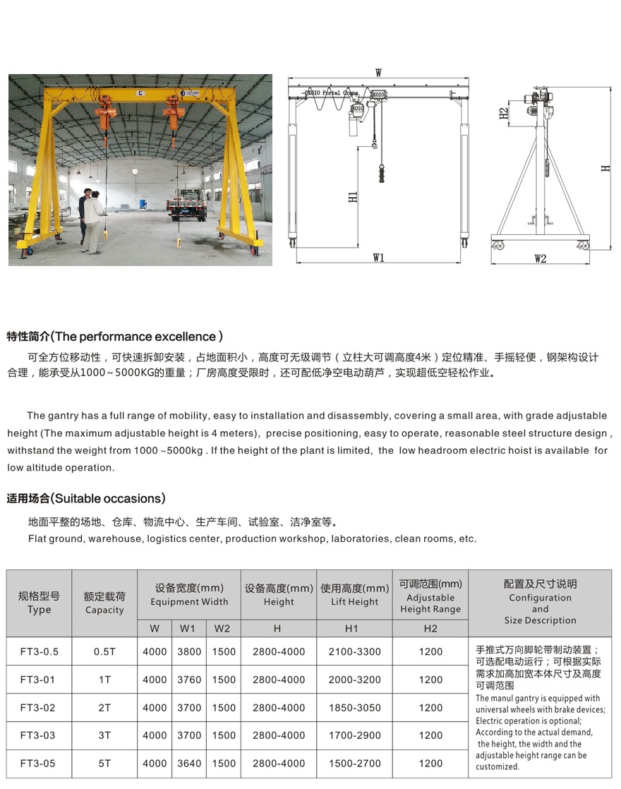 適用于制造模具、汽修工廠、礦山、工地及需要起重場(chǎng)合。該移動(dòng)龍門架的優(yōu)點(diǎn)是可全方位移動(dòng)性,可快速拆卸安裝,占地面積小,用微型汽車就可轉(zhuǎn)移到另一個(gè)場(chǎng)地安裝使用。寬度、高度可分級(jí)調(diào)節(jié),鋼架構(gòu)設(shè)計(jì)合理,能承受從100~5000kg重量。尤其適用于車間設(shè)備的安裝、搬運(yùn)、調(diào)節(jié)、車上貨品的裝卸搬運(yùn),汽車維修生產(chǎn)車間起吊柴油發(fā)動(dòng)機(jī)重件等。簡(jiǎn)單龍門架下安裝有萬向載重輪,可在整平路面上多方位中移動(dòng)吊裝物件;根據(jù)電動(dòng)式或人力資源大葫蘆,建立起重吊裝專業(yè)化。可降低人力資源,降低成本經(jīng)營(yíng)成本,效率提高。龍門架需依據(jù)顧客的當(dāng)場(chǎng)狀況訂制不一樣的商品。中移動(dòng)小龍門架吊裝大葫蘆可采用手動(dòng)葫蘆或電葫蘆,商品應(yīng)用性強(qiáng)。