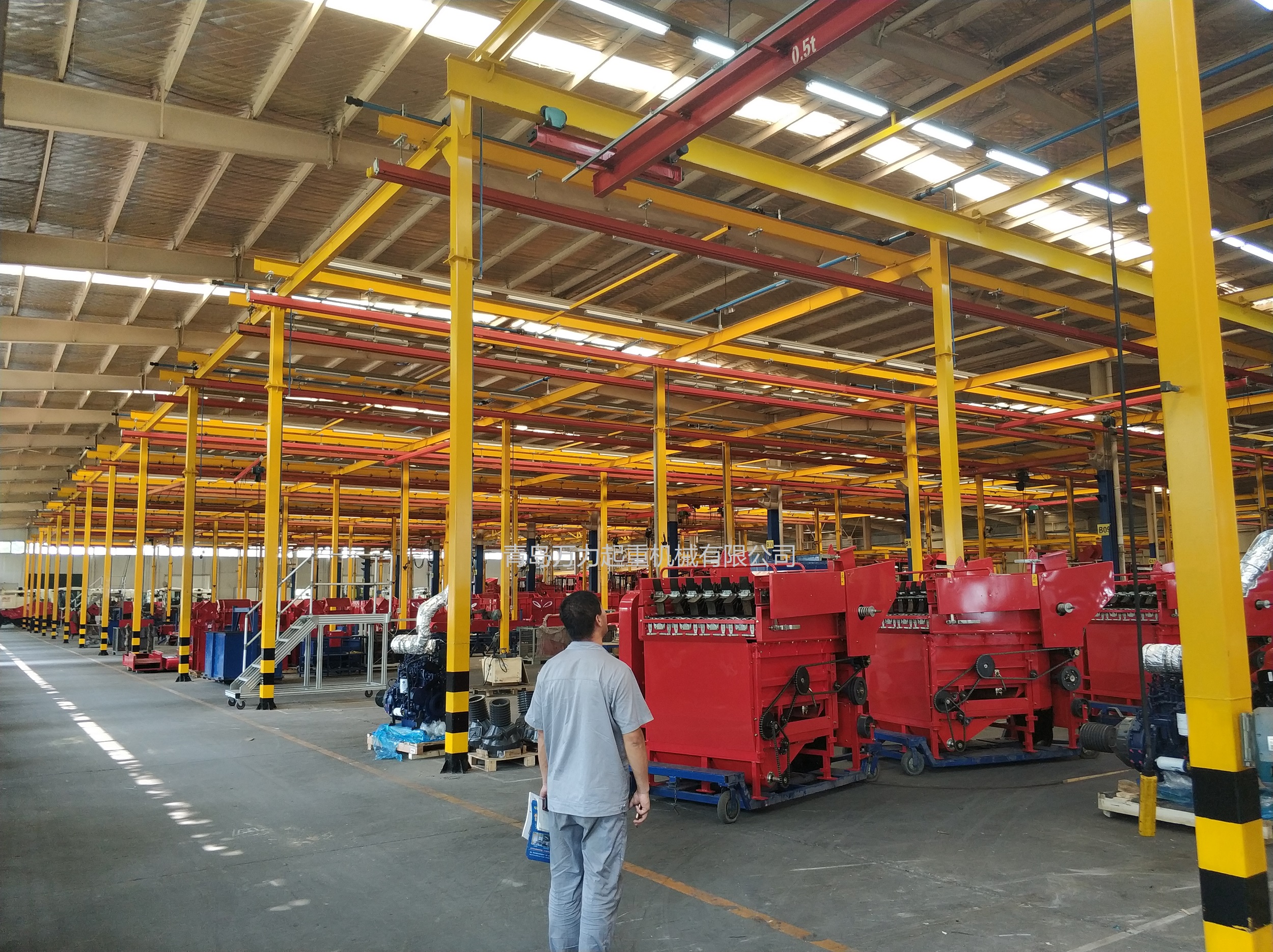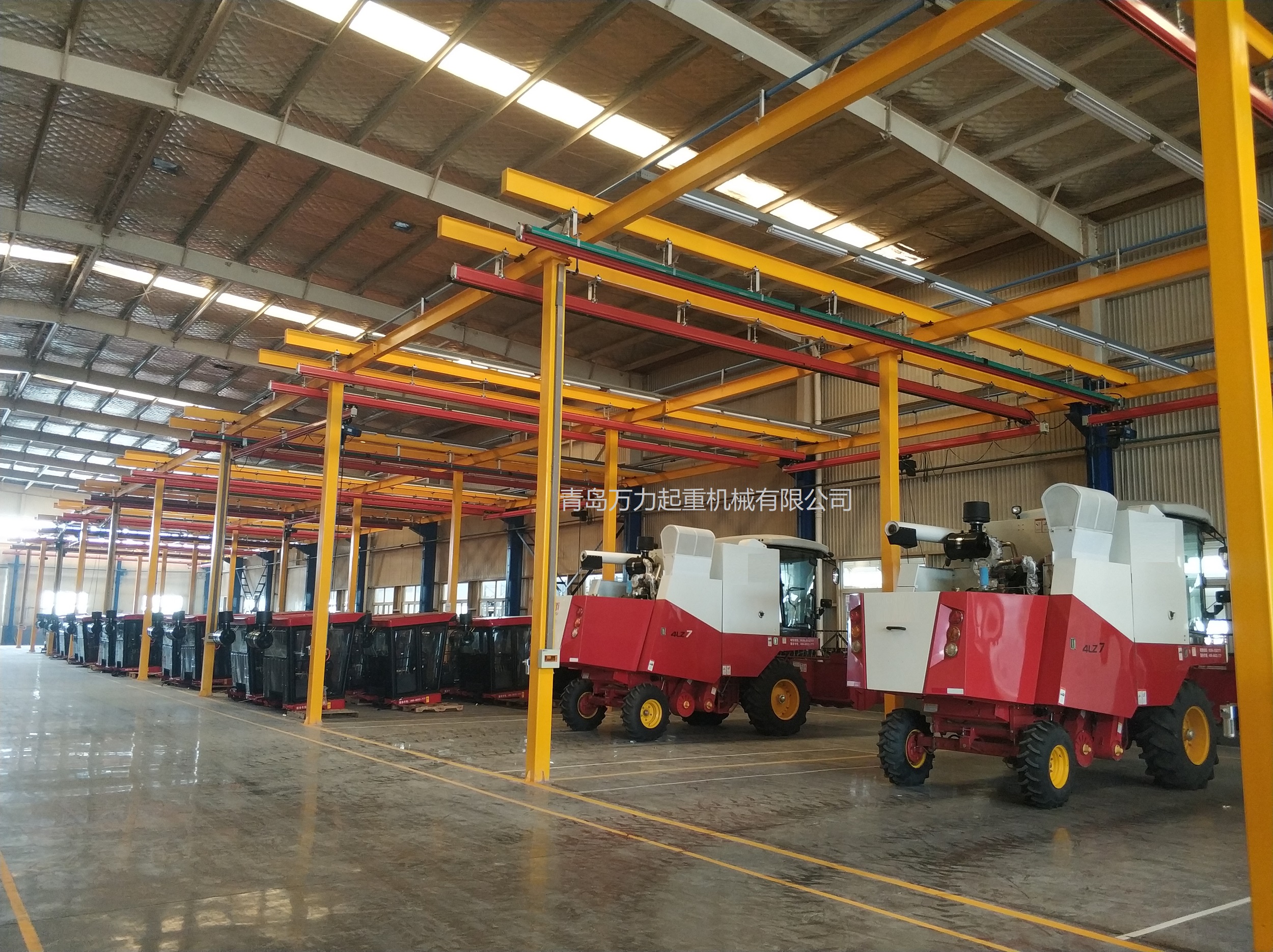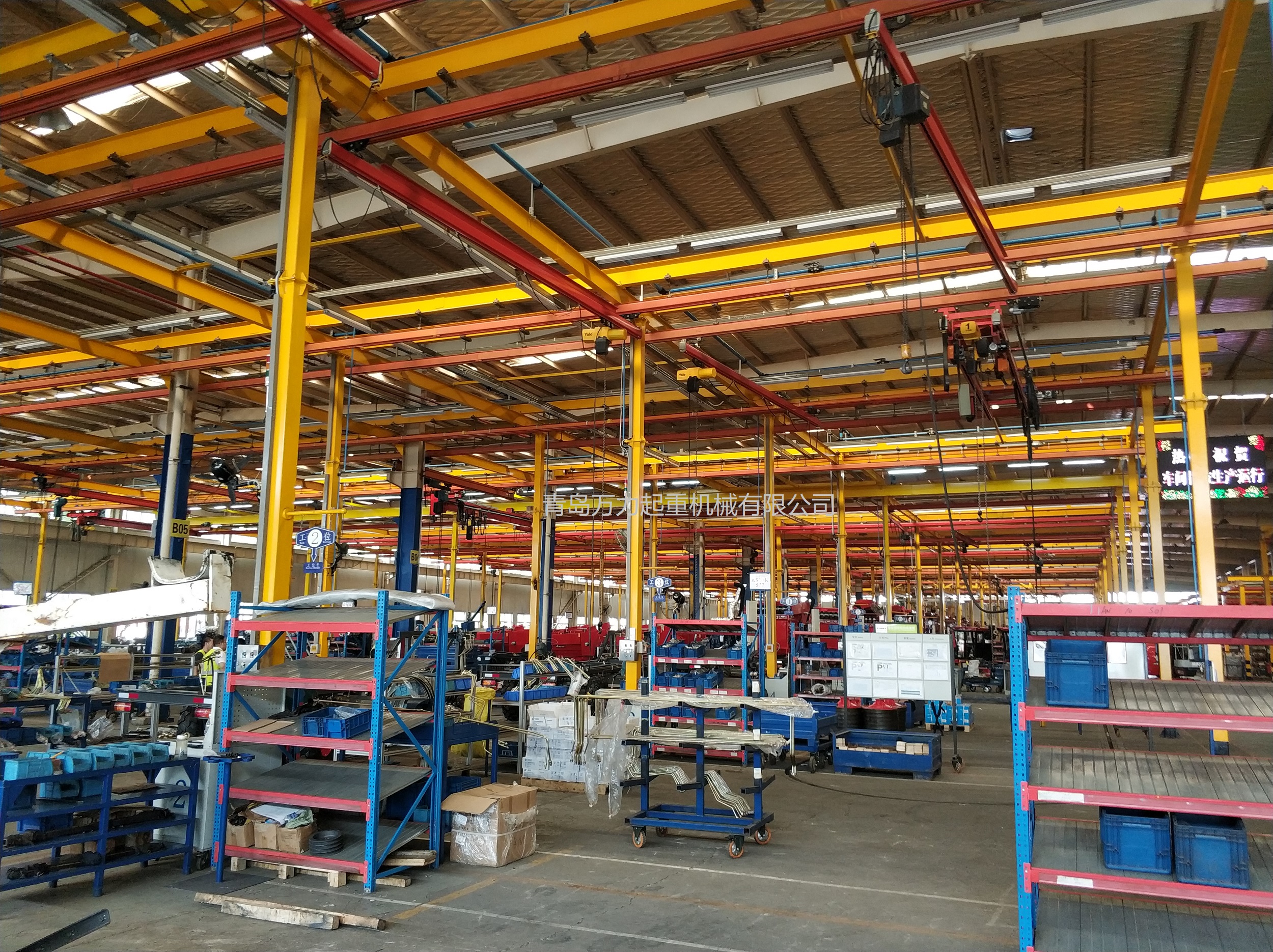 KBK,為Kombiniert Kran的縮寫,意為組合式起重機(jī)。主要由軌道、懸掛裝置、行走小車和一些功能組件構(gòu)成,所有模塊都為標(biāo)準(zhǔn)組件。起升裝置主要采用環(huán)鏈電動(dòng)葫蘆,也可吊掛一些機(jī)械手或焊槍之類,作為工具滑軌使用。起重量一般為125kg-2000kg。KBK軌道-采用Ω形狀,2片焊接而成。常用的是KBKII型軌道,多根軌道可用高強(qiáng)度螺栓連接。彎軌的轉(zhuǎn)彎半徑1.5m,大彎可用直軌搭配。沒有更小半徑的,會(huì)對(duì)小車運(yùn)行有影響。(KBKI型軌道轉(zhuǎn)彎半徑1m,在此不做介紹)。也可在KBKII型軌道內(nèi)側(cè)安裝內(nèi)置滑觸線,用于葫蘆供電,稱為KBKII-R型。懸掛裝置一般可以安裝在工字鋼/H型鋼下緣,有一定自鎖功能,安裝簡(jiǎn)便牢靠。功能組件包括:道岔,十字轉(zhuǎn)盤,升降段等。KBK組合起重機(jī)包括-單軌起重機(jī)、-單梁起重機(jī)、-雙梁起重機(jī)、-伸縮梁、-堆垛機(jī)等各種型式的起重設(shè)備,起重量0.125t~2t適應(yīng)范圍極廣,尤其適用于現(xiàn)代化生產(chǎn)輸送線,其特點(diǎn)概述如下: 1、可靠性好、穩(wěn)定性高 KBK輕型起重機(jī)系統(tǒng)的組成部件全部是標(biāo)準(zhǔn)模塊,可以保證大批量、高質(zhì)量生產(chǎn),因而系統(tǒng)十分可靠;系統(tǒng)模塊的主體是三種規(guī)格的冷軋型材,強(qiáng)度大,剛度好,自重輕,保證了系統(tǒng)的穩(wěn)定性。 2、適應(yīng)能力強(qiáng) KBK系統(tǒng)可根據(jù)工廠各工位的需要,靈活地設(shè)計(jì)安裝起重機(jī)系統(tǒng),從定點(diǎn)運(yùn)送到高準(zhǔn)確度地多點(diǎn)、多節(jié)拍的自動(dòng)化輸送線,都能隨意組合而成。可用于新設(shè)計(jì)的廠房,也可用于舊系統(tǒng)的改造或延伸。3、安裝方便,經(jīng)濟(jì)高效 KBK系統(tǒng)的安裝調(diào)試很方便,型材及各標(biāo)準(zhǔn)模塊之間只須用螺栓連接即可使用,可節(jié)省工廠的空間和面積,大大減少了人力資源,提高生產(chǎn)效率,從而降低能耗,提高企業(yè)效益。系統(tǒng)可以手動(dòng)操作,也可以實(shí)現(xiàn)自動(dòng)、半自動(dòng)操作,運(yùn)行高效。