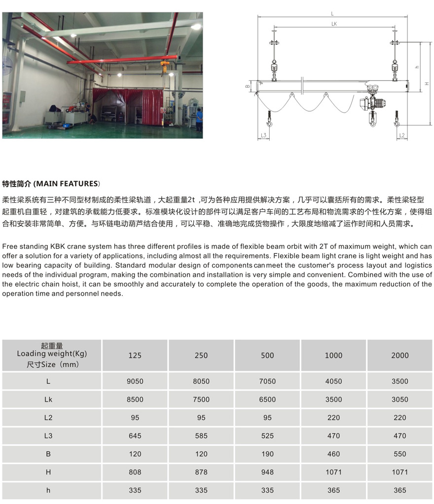 KBK,為KombiniertKran的縮寫,意為組合式起重機(jī),主要由軌道、懸掛裝置、行走小車和一些功能組件構(gòu)成,所有模塊都為標(biāo)準(zhǔn)組件。起升裝置主要采用環(huán)鏈電動(dòng)葫蘆,也可吊掛一些機(jī)械手或焊槍之類,作為工具滑軌使用,起重量一般為125kg-2000kg。KBK軌道采用Ω形狀,2片焊接而成。常用的是KBKII型軌道,多根軌道可用高強(qiáng)度螺栓連接。彎軌的轉(zhuǎn)彎半徑1.5m,大彎可用直軌搭配。沒有更小半徑的,會(huì)對(duì)小車運(yùn)行有影響。(KBKI型軌道轉(zhuǎn)彎半徑1m,在此不做介紹)。也可在KBKII型軌道內(nèi)側(cè)安裝內(nèi)置滑觸線,用于葫蘆供電,稱為KBKII-R型。懸掛裝置一般可以安裝在工字鋼/H型鋼下緣,有一定自鎖功能,安裝簡(jiǎn)便牢靠。功能組件包括:道岔,十字轉(zhuǎn)盤,升降段等。KBK組合起重機(jī)包括單軌起重機(jī)、單梁起重機(jī)、雙梁起重機(jī)、伸縮梁、堆垛機(jī)等各種型式的起重設(shè)備,起重量0.125t~2t適應(yīng)范圍極廣,尤其適用于現(xiàn)代化生產(chǎn)輸送線,其特點(diǎn)如下: